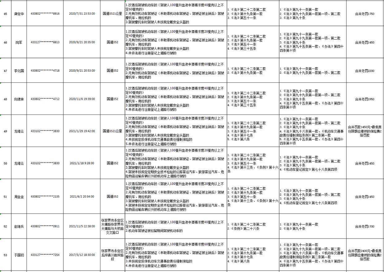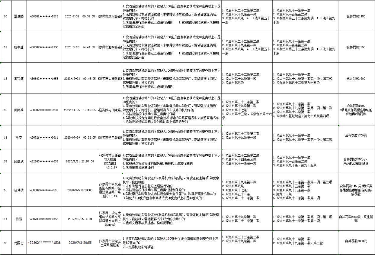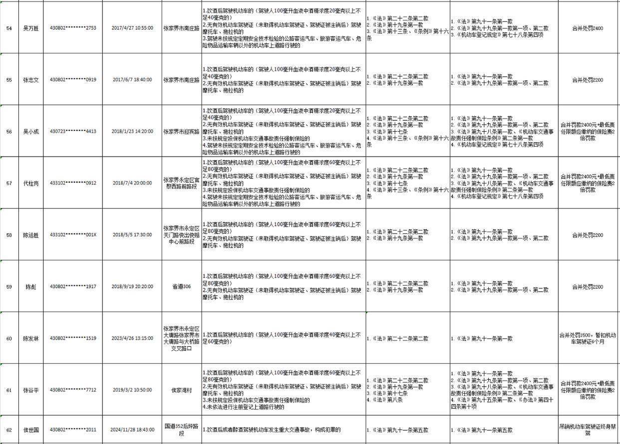 根据《中华人民共和国行政处罚法》第四十四条、《公安机关办理行政案件程序规定》第一百四十三条及第一百四十四条之规定 ,下列道路交通违法行为人(具体违法当事人信息、违法事实、处罚种类及处罚标准详见附件)涉嫌违反道路交通安全法律法规,且无法直接送达行政处罚告知书,现依法向其公告告知拟作出行政处罚的相关事项如下:一、拟作出行政处罚的事实、理由及依据违法行为人在张家界市永定区辖区内实施了道路交通违法行为,且均有现场执法记录等证据予以证实。上述行为违反了《中华人民共和国道路交通安全法》《湖南省实施办法》等相关规定,本大队拟依据对应法律条文,对相关违法行为人作出吊销驾驶证、暂扣驾驶证、罚款等行政处罚。二、当事人依法享有的权利自本公告发布之日起七日内,当事人有权向本大队提出陈述、申辩意见;符合法定听证条件的,可依法向本大队申请听证。逾期未提出陈述、申辩或听证申请的,视为放弃上述权利,本大队将依法作出行政处罚决定。三、联系方式联系单位:张家界市公安局交通警察支队直属一大队联系地址:张家界市永定区沙堤街道高桥社区联系人:卢警官联系电话:18974490634办公时间:工作日上午8:30-12:00,下午13:30-17:00特此公告。张家界市公安局交通警察支队直属一大队2025年12月18日