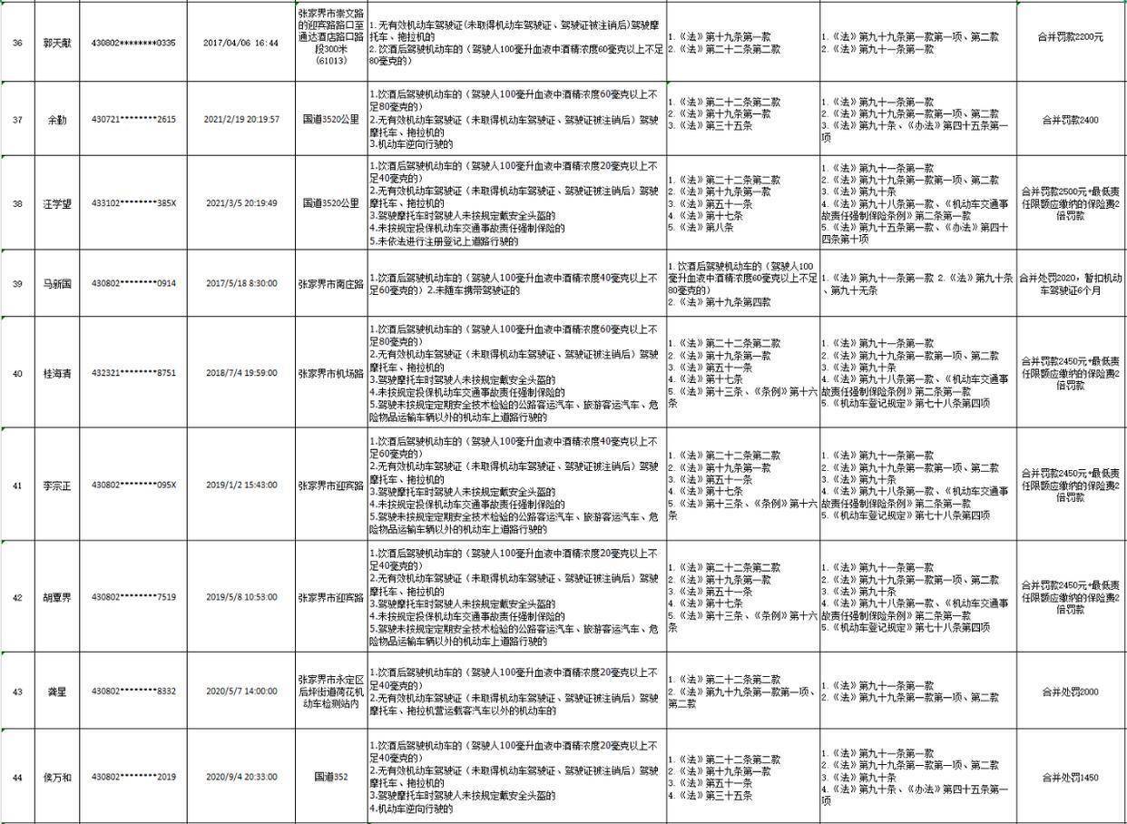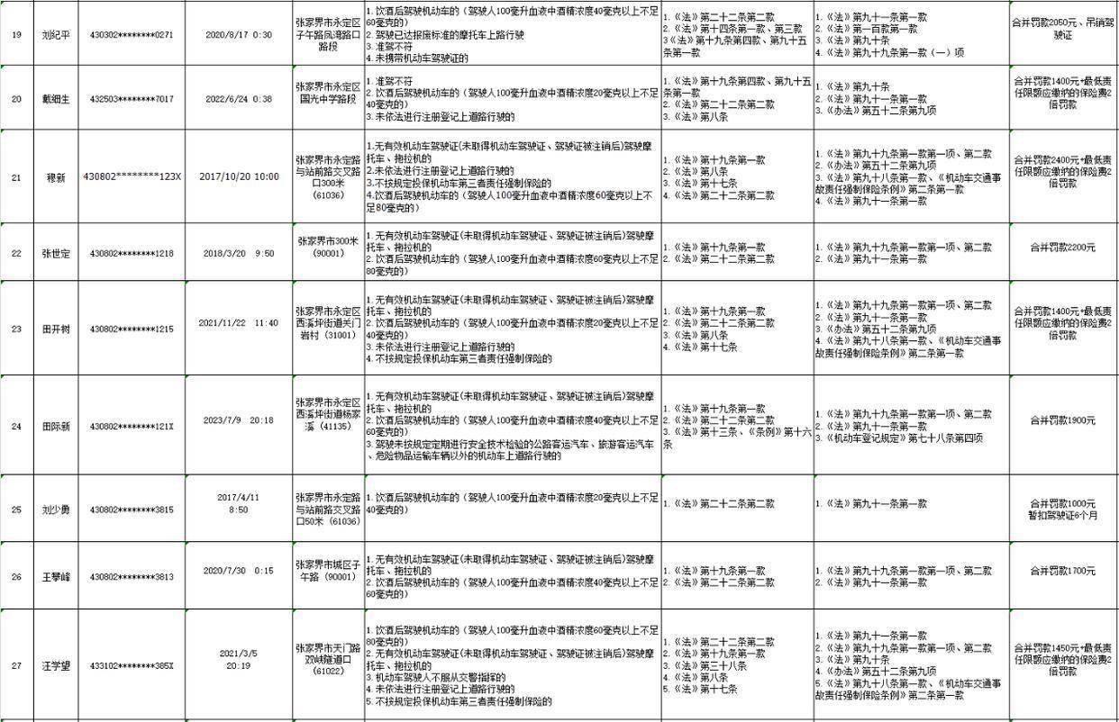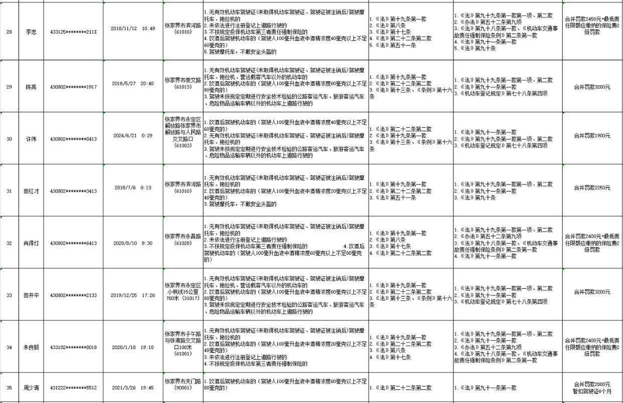 根据《中华人民共和国行政处罚法》第四十四条、《公安机关办理行政案件程序规定》第一百四十三条及第一百四十四条之规定 ,下列道路交通违法行为人(具体违法当事人信息、违法事实、处罚种类及处罚标准详见附件)涉嫌违反道路交通安全法律法规,且无法直接送达行政处罚告知书,现依法向其公告告知拟作出行政处罚的相关事项如下:一、拟作出行政处罚的事实、理由及依据违法行为人在张家界市永定区辖区内实施了道路交通违法行为,且均有现场执法记录等证据予以证实。上述行为违反了《中华人民共和国道路交通安全法》《湖南省实施办法》等相关规定,本大队拟依据对应法律条文,对相关违法行为人作出吊销驾驶证、暂扣驾驶证、罚款等行政处罚。二、当事人依法享有的权利自本公告发布之日起七日内,当事人有权向本大队提出陈述、申辩意见;符合法定听证条件的,可依法向本大队申请听证。逾期未提出陈述、申辩或听证申请的,视为放弃上述权利,本大队将依法作出行政处罚决定。三、联系方式联系单位:张家界市公安局交通警察支队直属一大队联系地址:张家界市永定区沙堤街道高桥社区联系人:卢警官联系电话:18974490634办公时间:工作日上午8:30-12:00,下午13:30-17:00特此公告。张家界市公安局交通警察支队直属一大队2025年12月18日