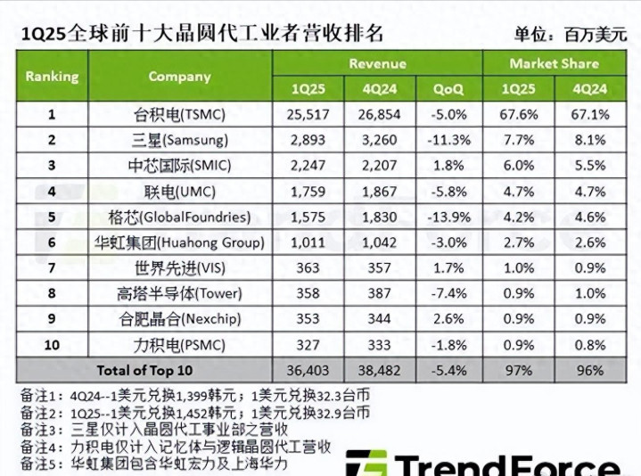 目前在全球的前10大芯片代工厂排名中,华虹半导体是排在第6位的,前面5家分别是台积电、三星、中芯国际、联电、格芯。